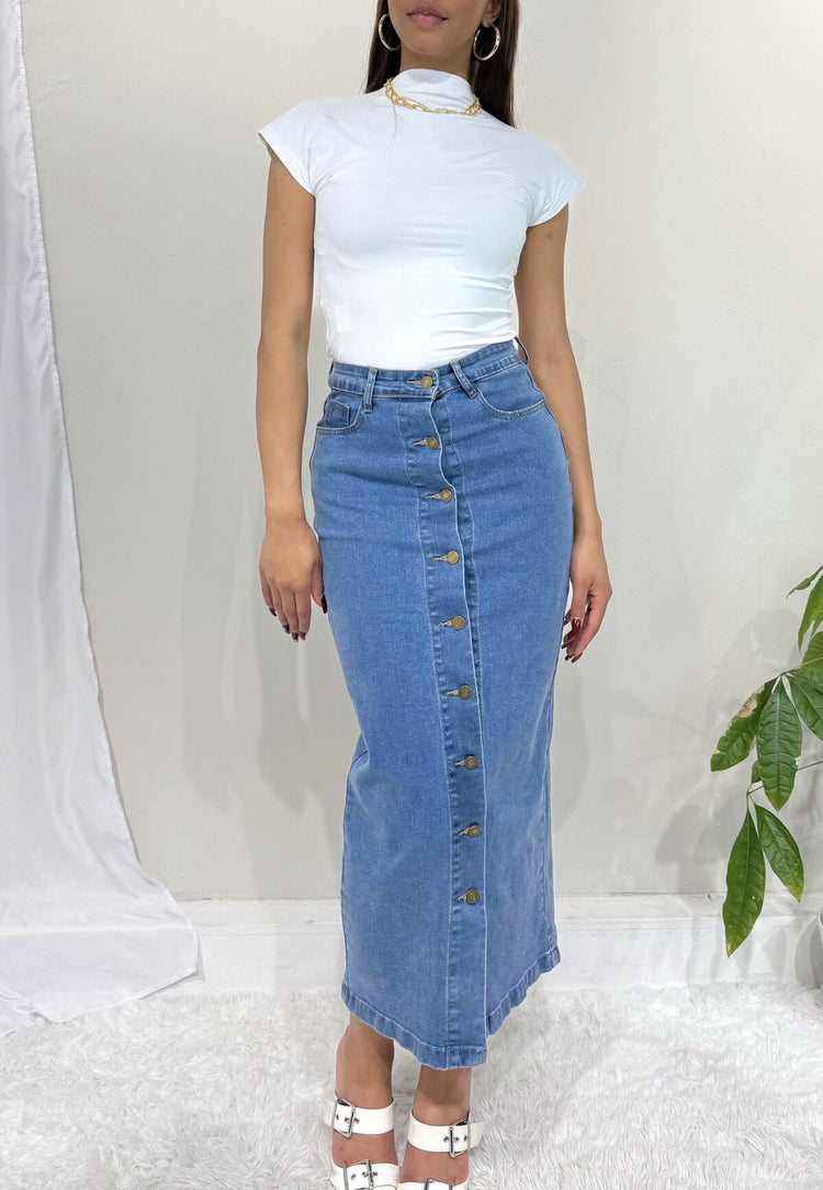 Jupe en denim de coton de qualité supérieure, dotée de détails de boutons distinctifs qui ajoutent du caractère à votre garde-robe. Coupe classique et intemporelle, cette pièce s'associe facilement avec vos basiques préférés pour créer des looks variés. Le tissu robuste en coton garantit durabilité et confort au quotidien. Parfaite pour les femmes qui recherchent une jupe polyvalente alliant style et praticité.