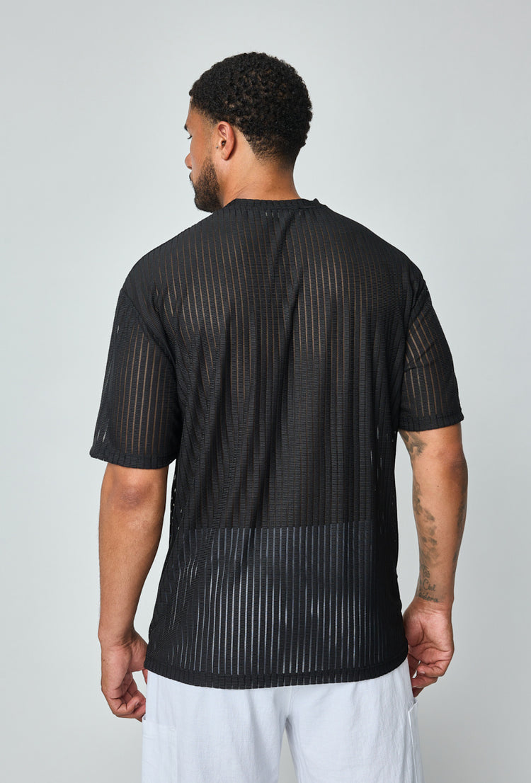 T-shirt transparent rayé uni oversized, manches courtes, col rond, rayures transparentes, bas coupe droite